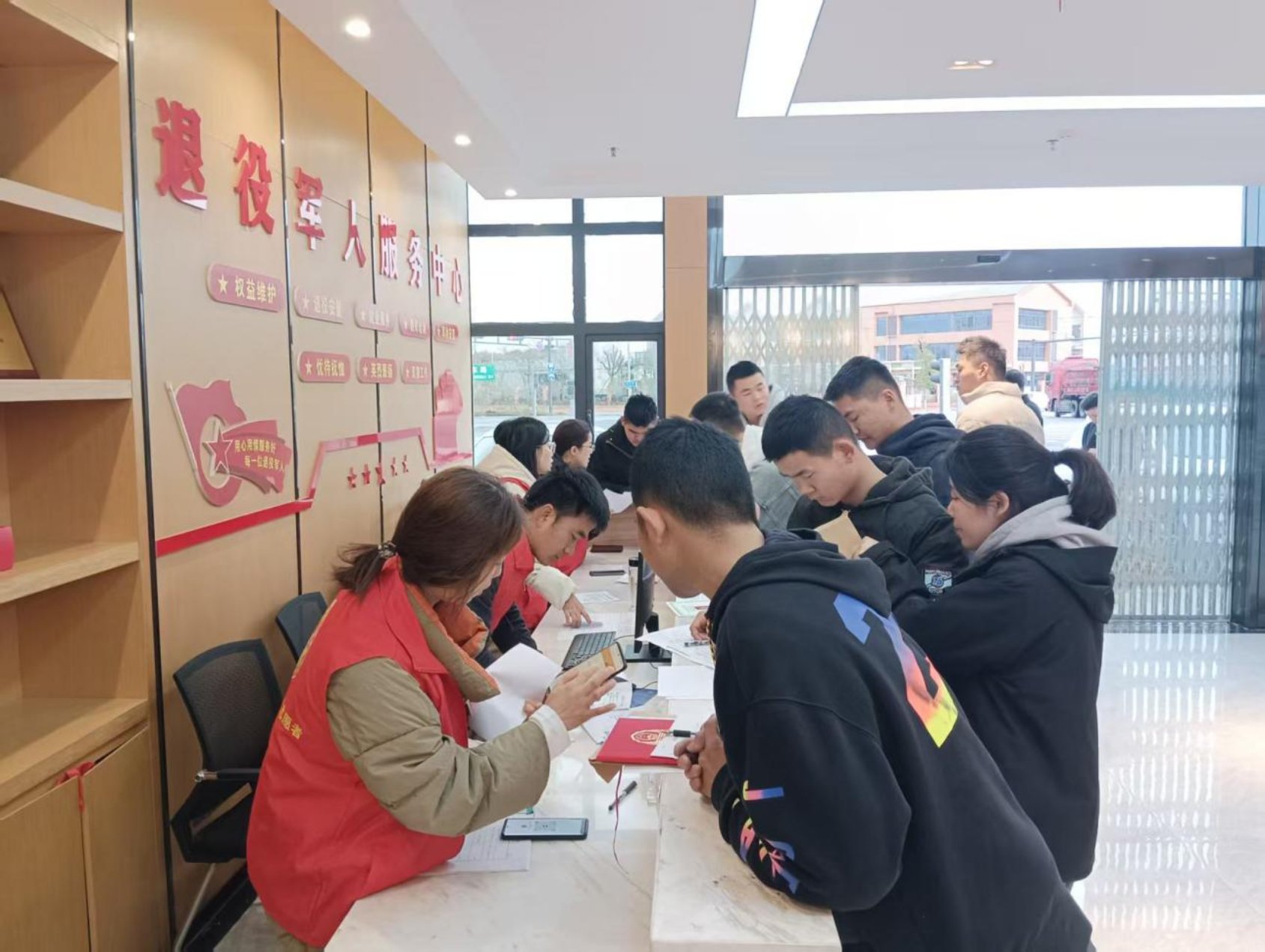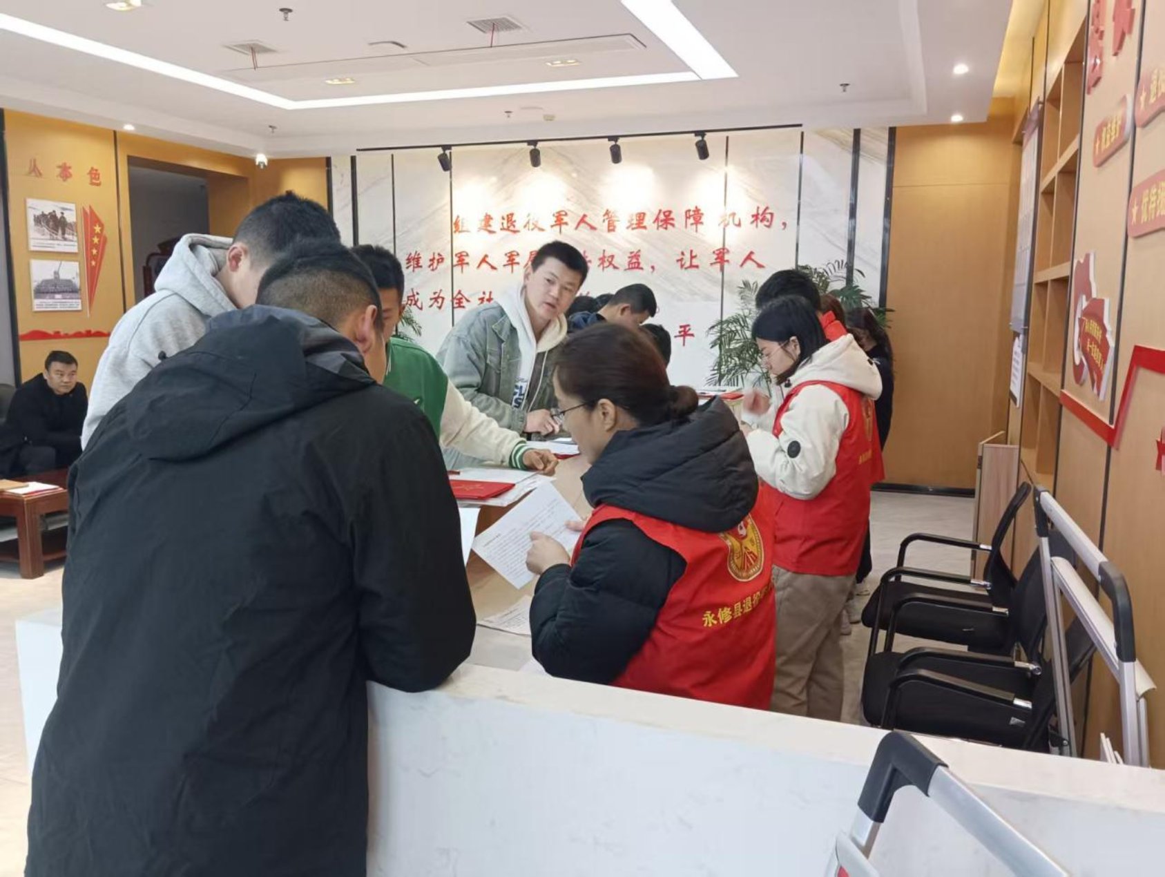 在县退役军人事务局一楼服务大厅,机关支部党员与退役军人服务志愿者围绕报到登记、材料审核、关系转接、落户、政策咨询、就业创业等事项,为我县46名2025年春季退役士兵提供“一站式”服务。