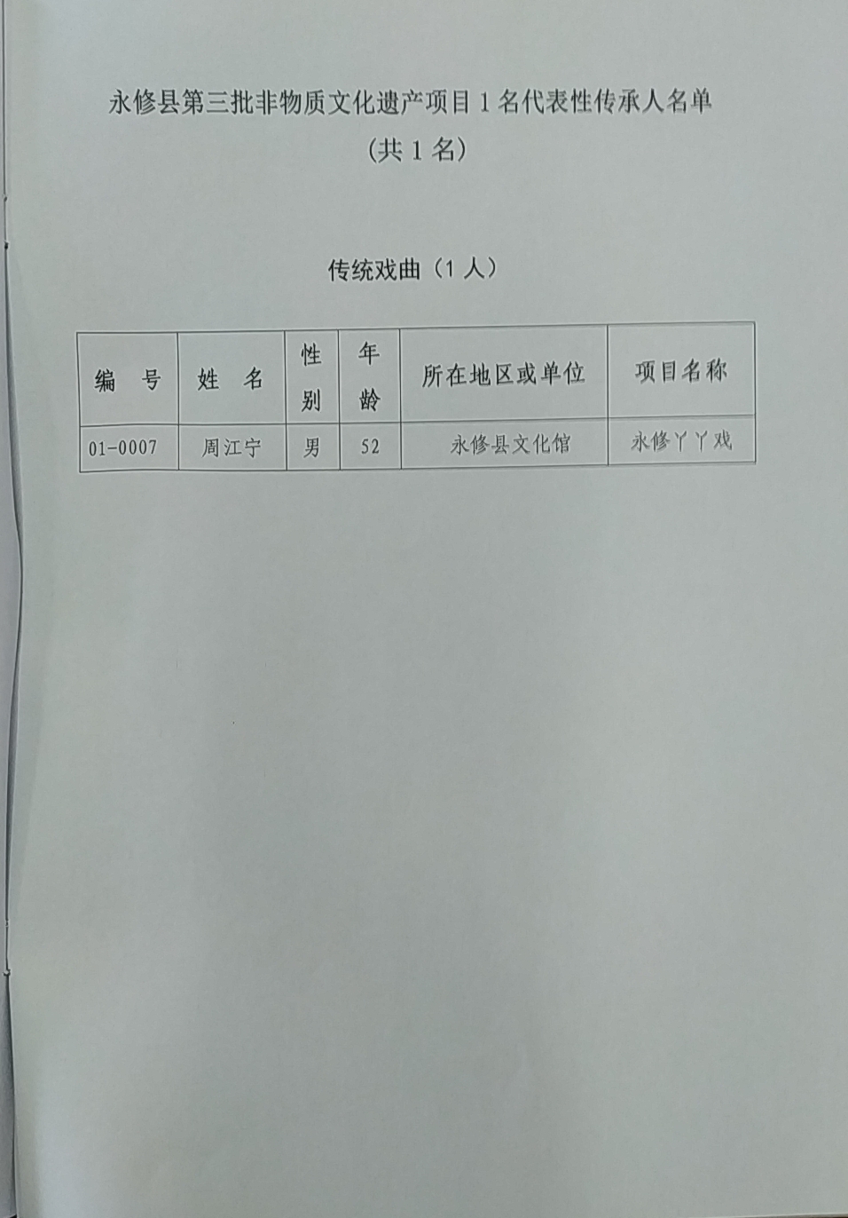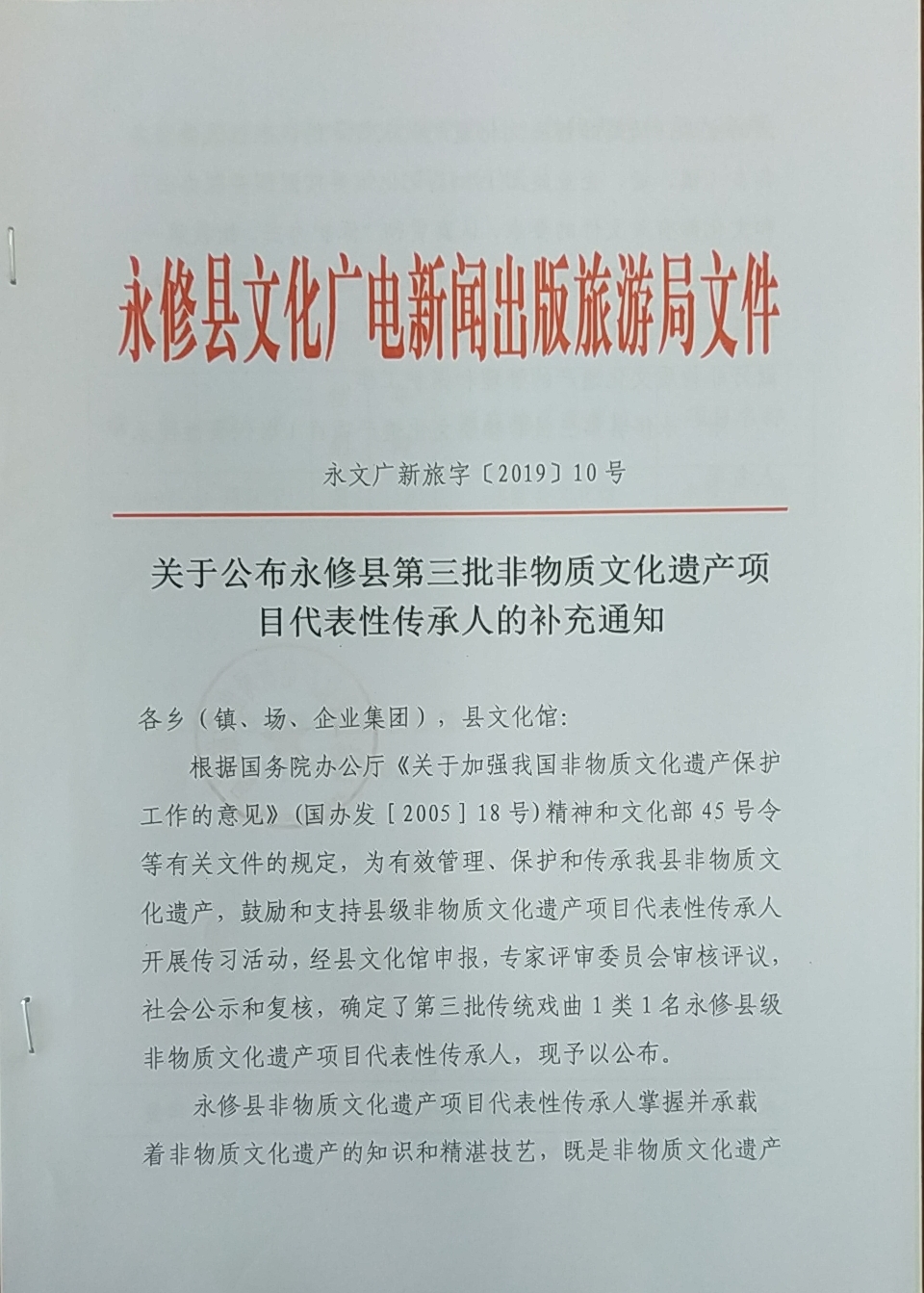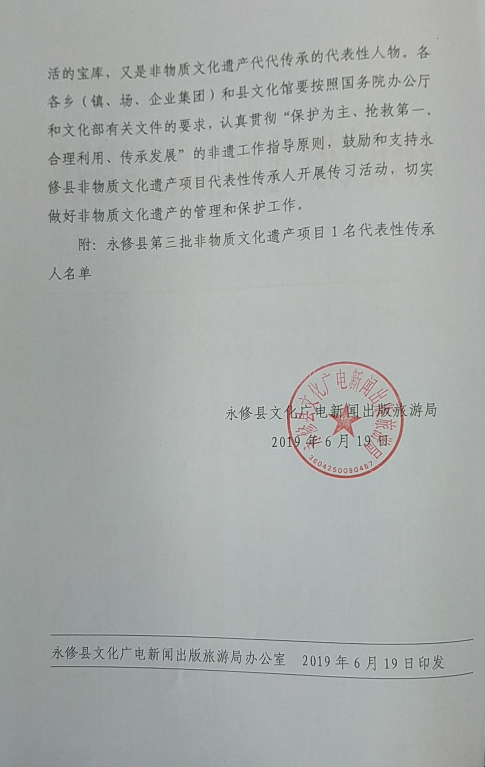 关于公布第三批永修县非物质文化遗产项目代表性传承人的补充通知