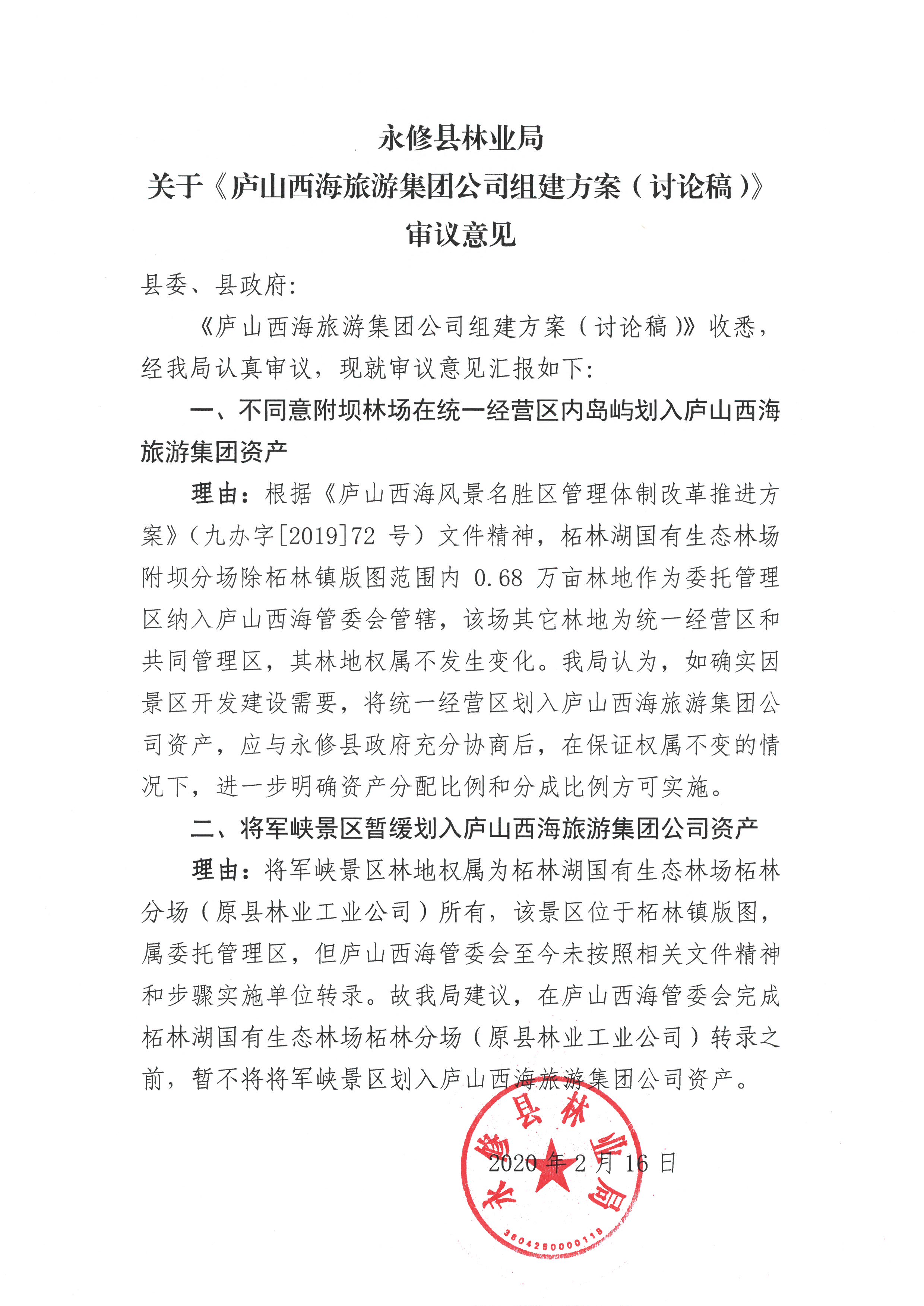 2.将军峡景区林地权属为柘林湖国有生态林场柘林分场(原县林业工业公司)所有,位于柘林镇版图,属委托管理区,但庐山西海管委会至今未按照相关文件精神和步骤实施单位转录。为此,建议在庐山西海管委会完成柘林湖国有生态林场柘林分场(原县林业工业公司)转录之前,暂不宜将将军峡景区划入庐山西海旅游集团公司资产。