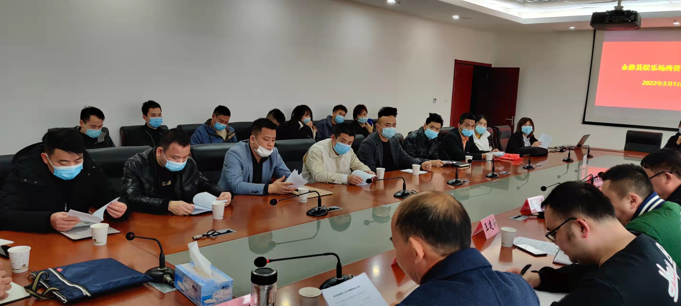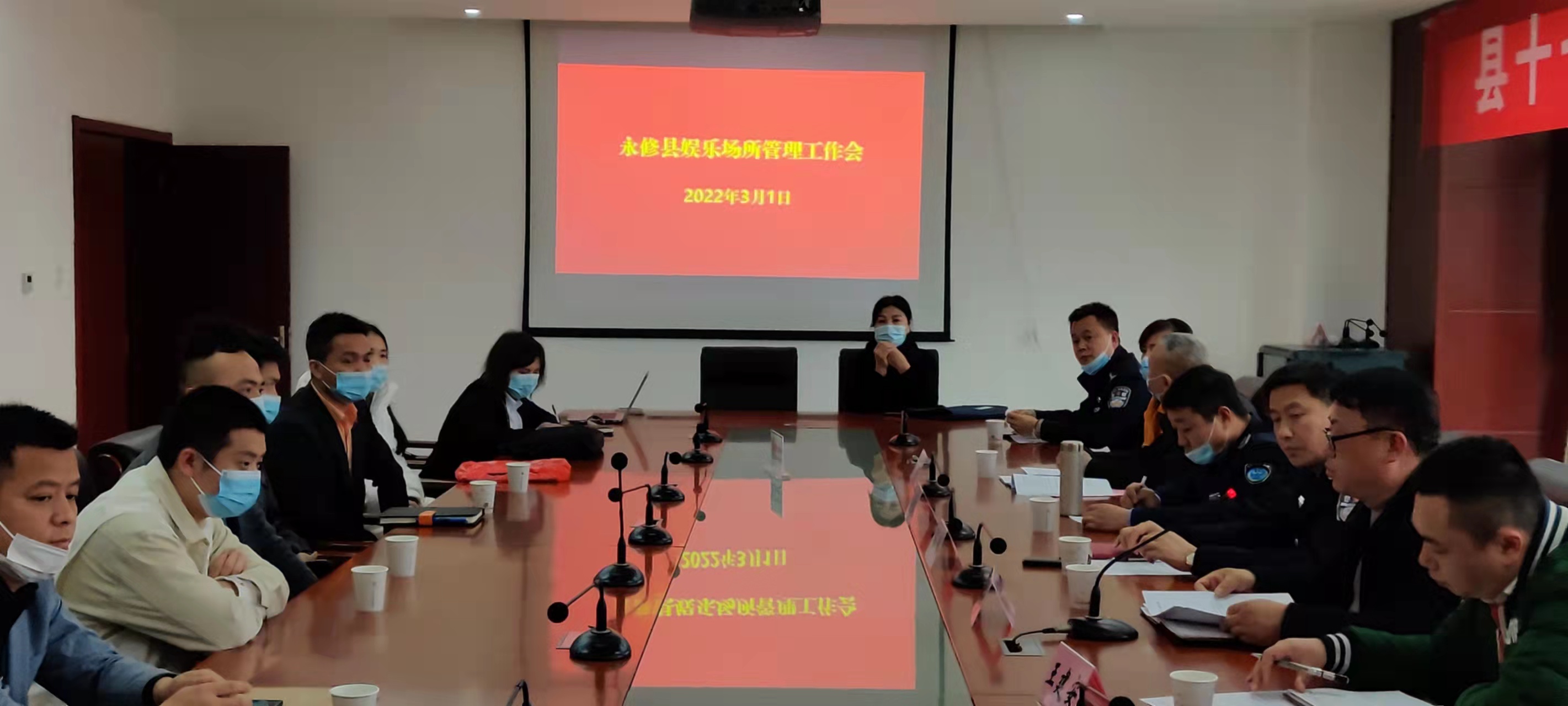 3月1日下午,永修县召开娱乐场所管理工作会,会议贯彻落实国务院《娱乐场所管理条例》和上级有关文件精神,分析我县歌舞娱乐行业经营管理的现状和发展趋势,查找歌舞娱乐场所经营中存在的问题,总结2021年工作并对2022年娱乐场所管理工作进行部署。县文化综合执法大队、县治安管理大队、县劳动保障监察大队、县卫生健康综合监督执法局和娱乐场所负责人参加会议。会议强调: