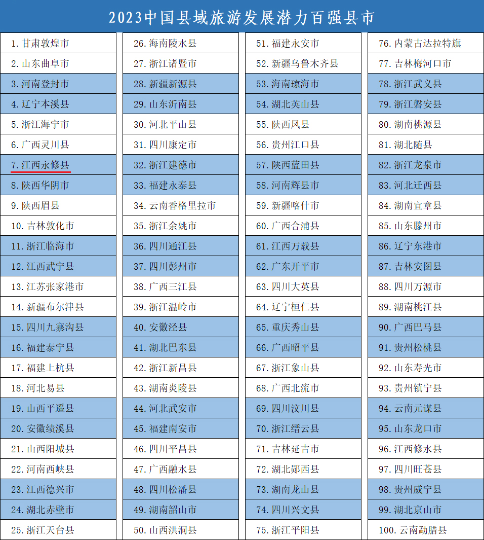 喜报: 永修县荣登“2023中国县域旅游发展潜力百强县市”榜单第7名
