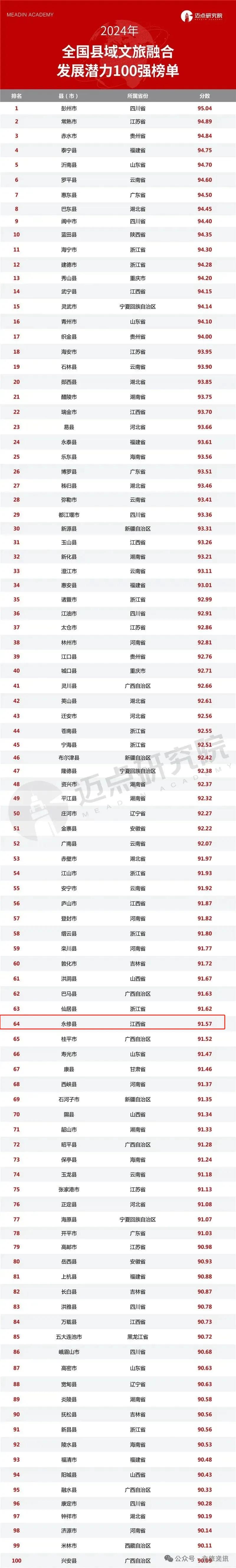 近日迈点研究院发布了2024年全国县域文旅融合发展潜力100强榜单,其中永修县上榜。