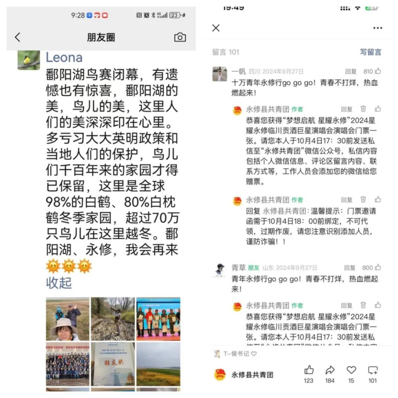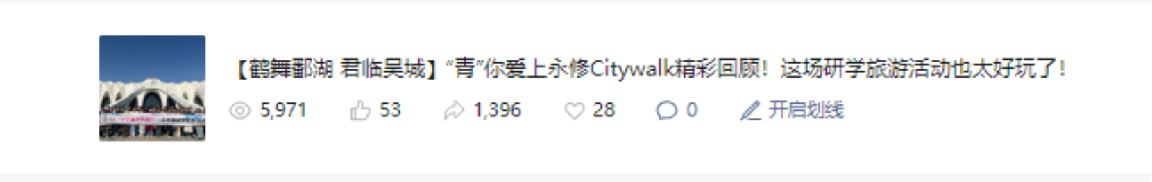 特色融合的研学主题。深入挖掘“旅游+”的潜力,把握观鸟季旅游市场脉搏,结合“2024年鄱阳湖国际观鸟赛”话题,吸引北京大学、同济大学、上海交通大学等20余所高校参加研学活动,点燃研学旅游的新引擎;按照“以文塑旅、以旅彰文”的思路,在“2024星耀永修演唱会”举办之际,宣传“音乐+旅游”游玩攻略,受到社会各界关注和点赞。