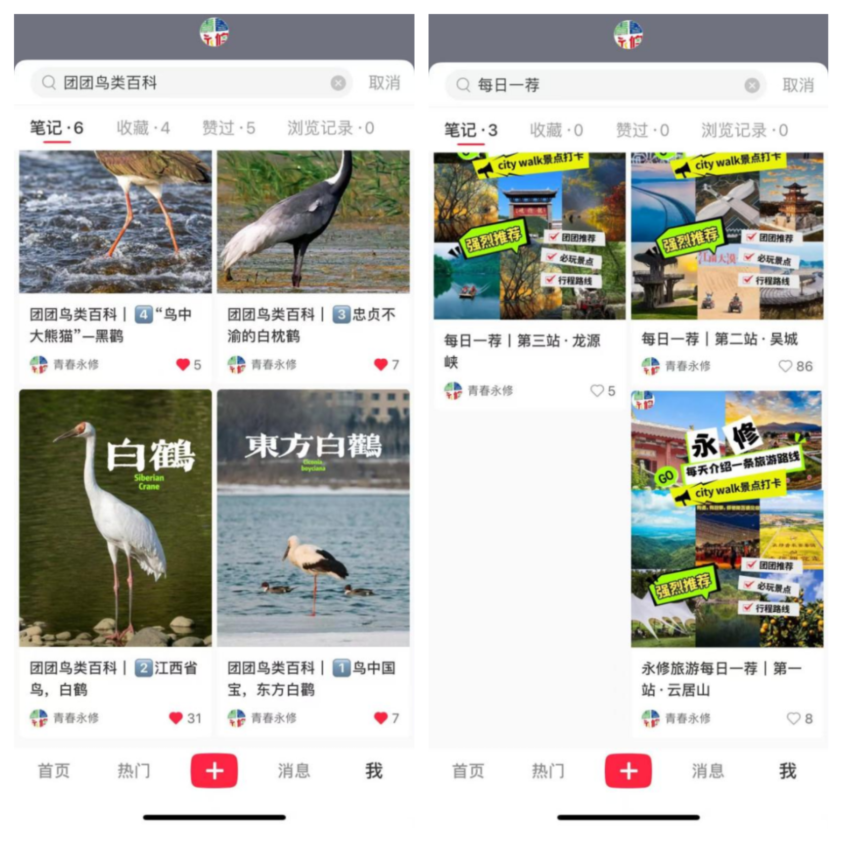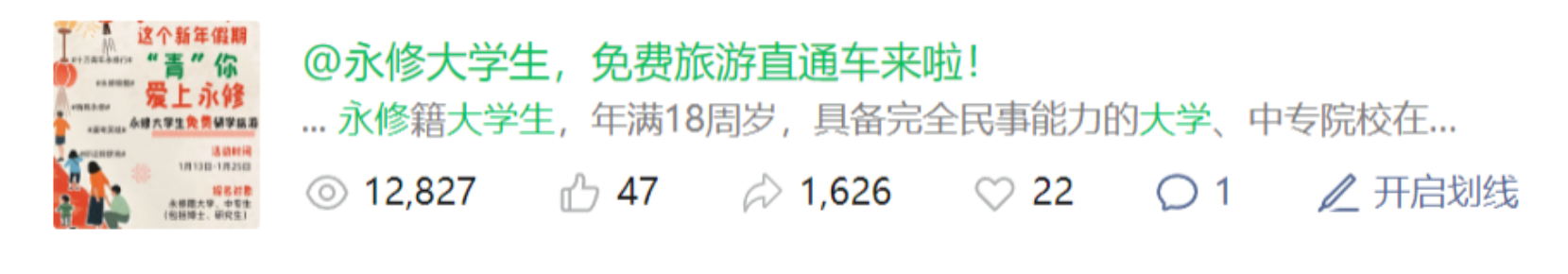 团县委锚定青年旅游市场需求,用青年喜闻乐见的方式,广泛宣传推介永修文旅资源,推动县域文旅“破题出圈”。线上发力,展魅力永修。通过“青春永修”微信公众号、小红书等媒体平台,向游客提供永修景区景点、旅游线路、美食推荐、住宿信息等旅游信息,开设“十万青年永修行”专栏,打响永修特色旅游品牌。2024年以来,已发布文旅信息50余篇,其中,《去吴城看鸟吧!还有大疆云台相机P3等你来拿!》《@永修大学生,“青”你爱上永修》,浏览量累计超3万人次,“青春永修”小红书开设《每天介绍一条永修旅游路线》《团团鸟类百科》等专栏,获得网友好评。