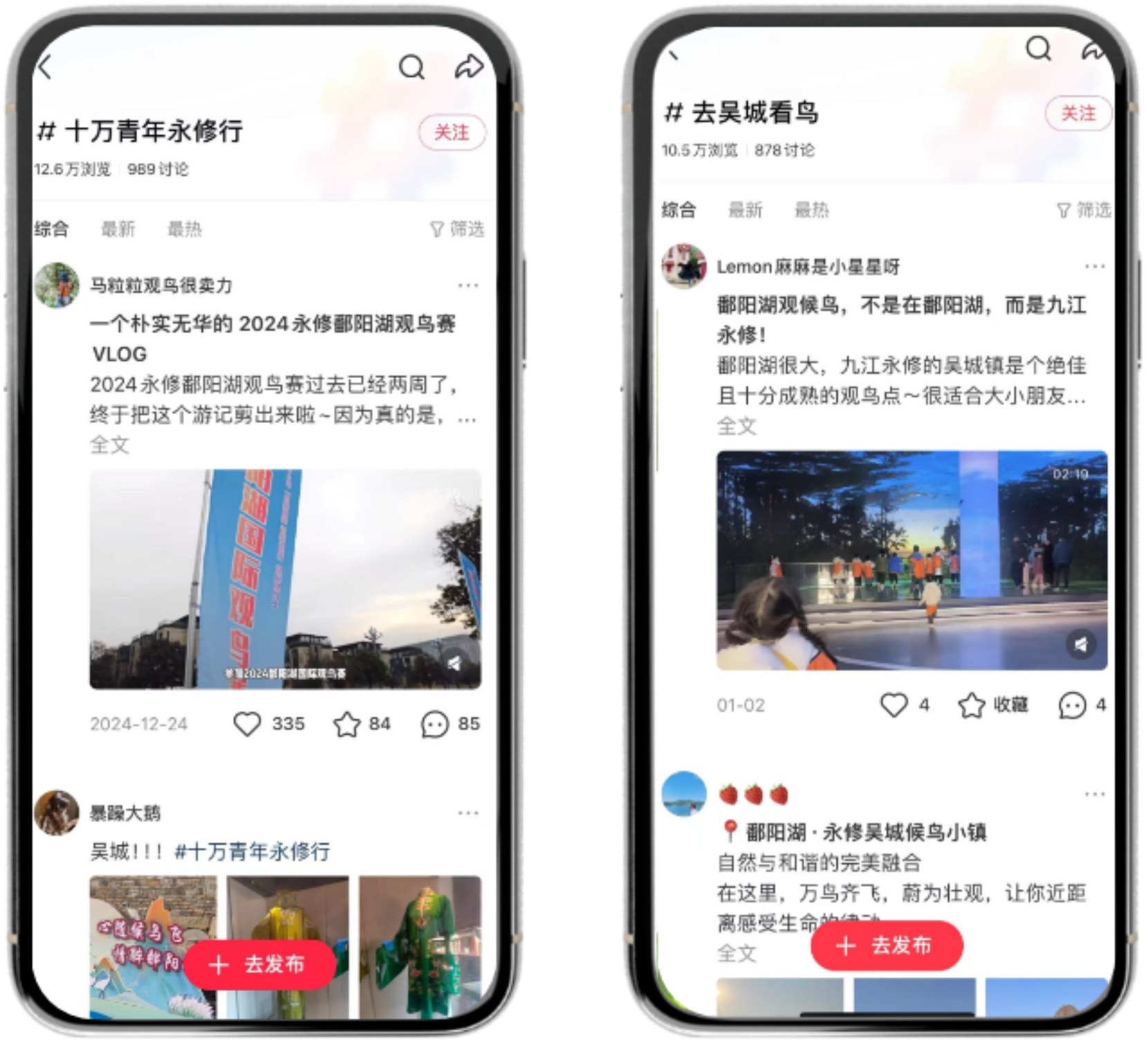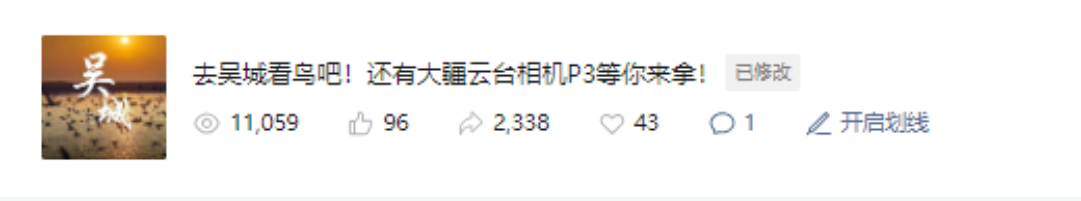 多方发力,发展潜力永修。依托鄱阳湖候鸟资源及2024年鄱阳湖国际观鸟大赛,开展《“去吴城看鸟吧”国际观鸟季旅游攻略创作大赛》,围绕“鄱阳湖国际观鸟季”主题,通过视频、图、文等方式,以永修文旅资源为切入点,进行线上创作。活动开展以来,网友化身“永修文旅推介官”,前往吴城实地游玩体验,在“小红书”发布旅游攻略、短视频作品200余个,创建了“去吴城看鸟吧”等热门话题,仅一个多月时间,平台话题浏览量超过20万,掀起永修文旅新热潮。