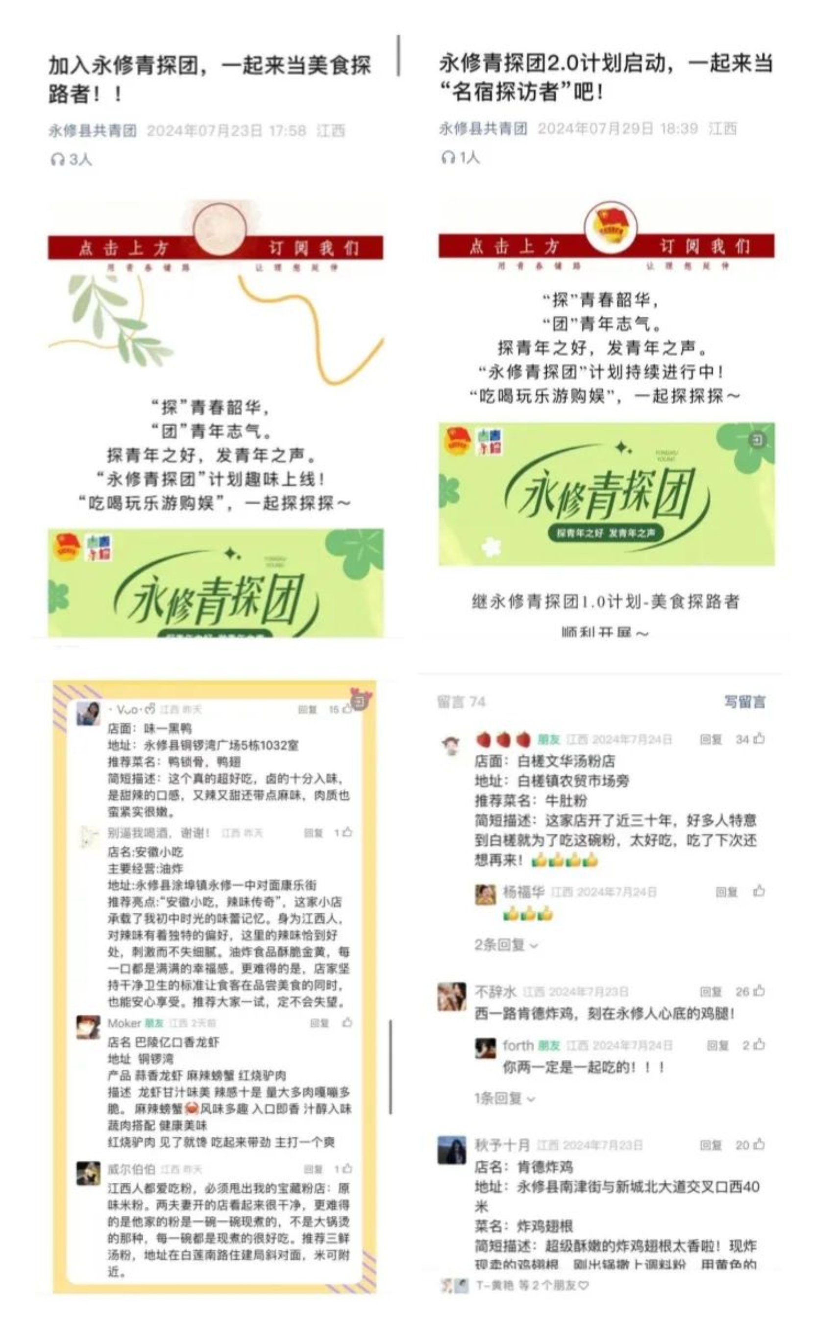 团县委推动产品和服务创新,解锁吸引游客的“流量密码”,打造更有活力、更具魅力的“十万青年永修行”品牌配套‘青’字号活动。青年探店引客来。结合青年消费特点,打造“永修‘青’探团”计划,评选县域内有特色的美食、民宿,邀请部分网友成为“美食民宿推介官”,感受“舌尖上的永修”“星辰下的永修”,网友纷纷表示,永修处处是美食、处处是美景。
