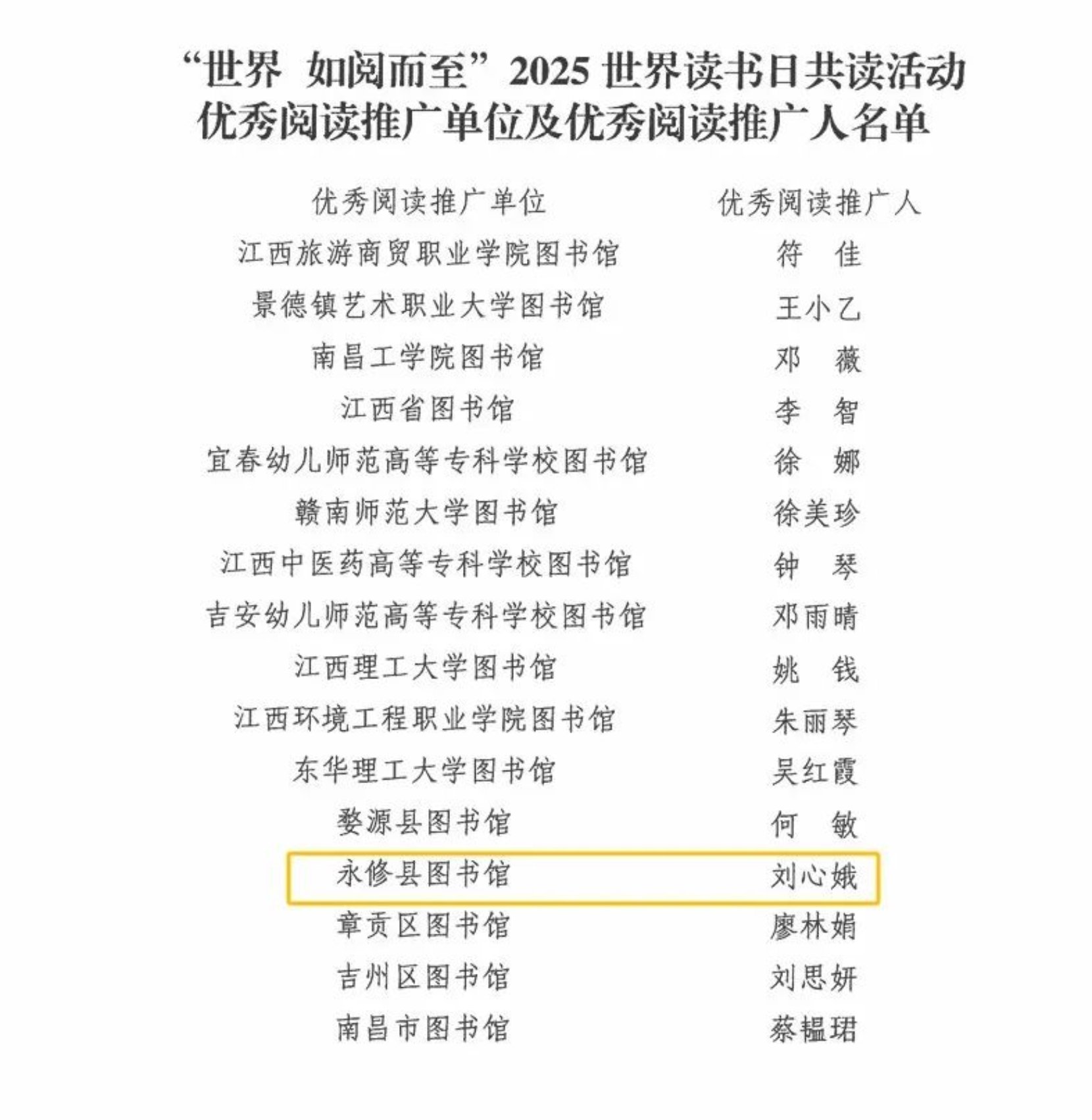喜报:永修县图书馆在“世界如阅而至”2025世界读书日共读活动中喜获佳绩!