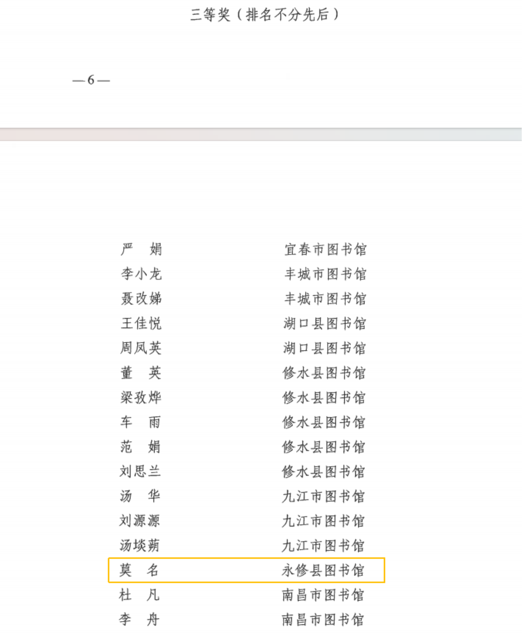 永修县图书馆积极组织读者参与、大力开展阅读推广活动,在此项活动中获得“优秀阅读推广单位”荣誉称号,馆员刘心娥被评为“优秀阅读推广人”。根据活动规则,永修县图书馆共有5名读者分别获得“世界 如阅而至”2025 世界读书日共读活动二等奖和三等奖,恭喜所有获奖者!