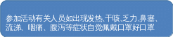1.参加活动人员如出现发热、干咳、乏力、鼻塞、流涕、咽痛、腹泻等症状,应当佩戴好口罩,并立即上报现场联络人员及医疗防疫工作人员。