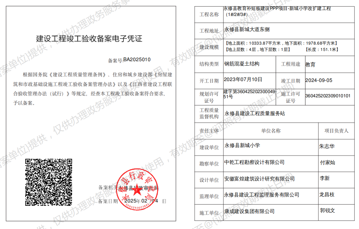 永修县教育补短板建设PPP项目-新城小学改扩建工程 (1#/2#/3#)建设工程竣工验收备案表