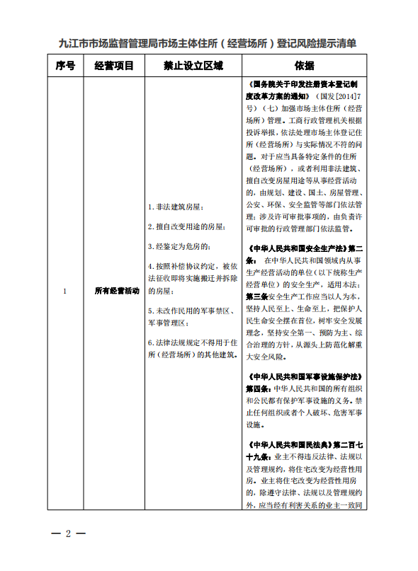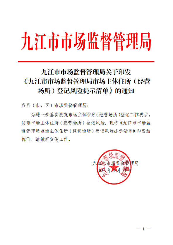 九江市市场监督管理局关于印发《九江市市场监督管理局市场主体住所(经营场所 ) 登记风险提示清单》的通知