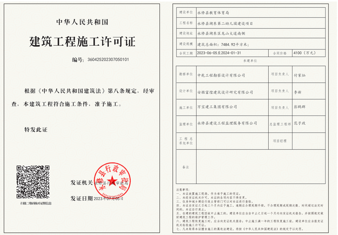 永修县湖东第二幼儿园建设项目建筑工程施工许可证