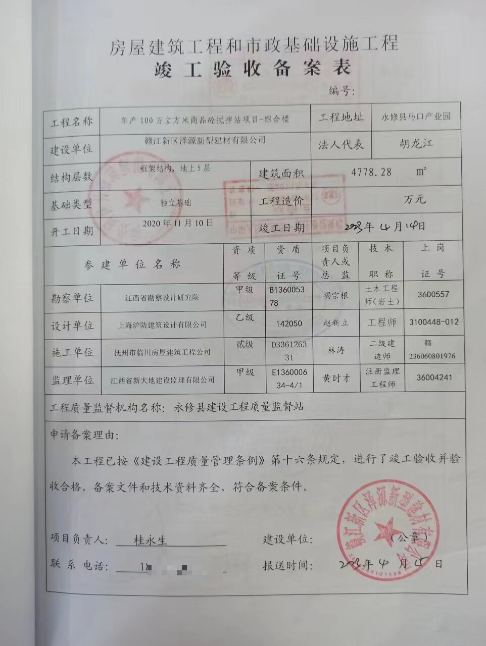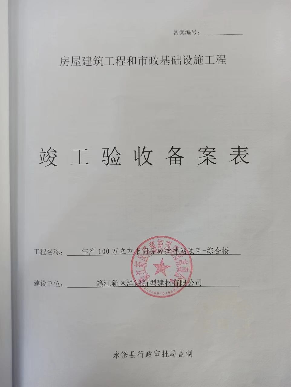 赣江新区泽源新型建材有限公司年产100万立方米商品砼搅拌站项目—综合楼竣工验收备案表