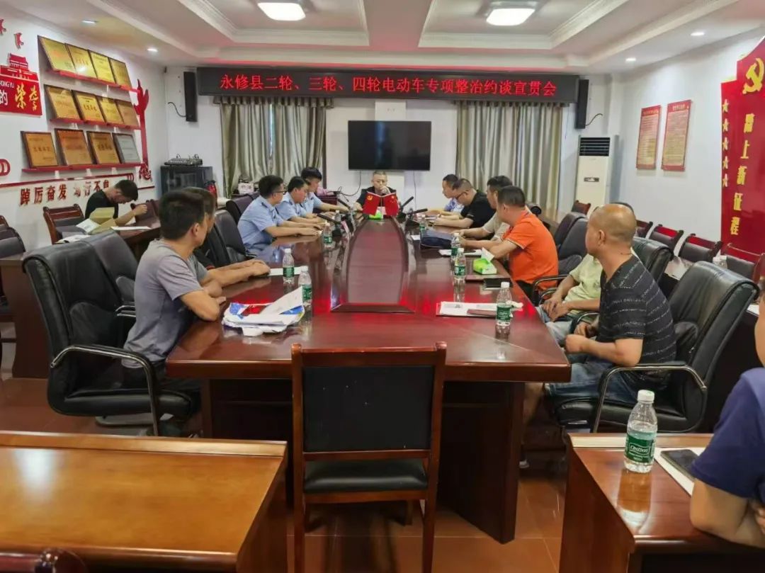 会议由永修县相关部门领导主持,交警、市场监管、交通运输等多个职能部门负责人以及部分电动车经销商代表参加。