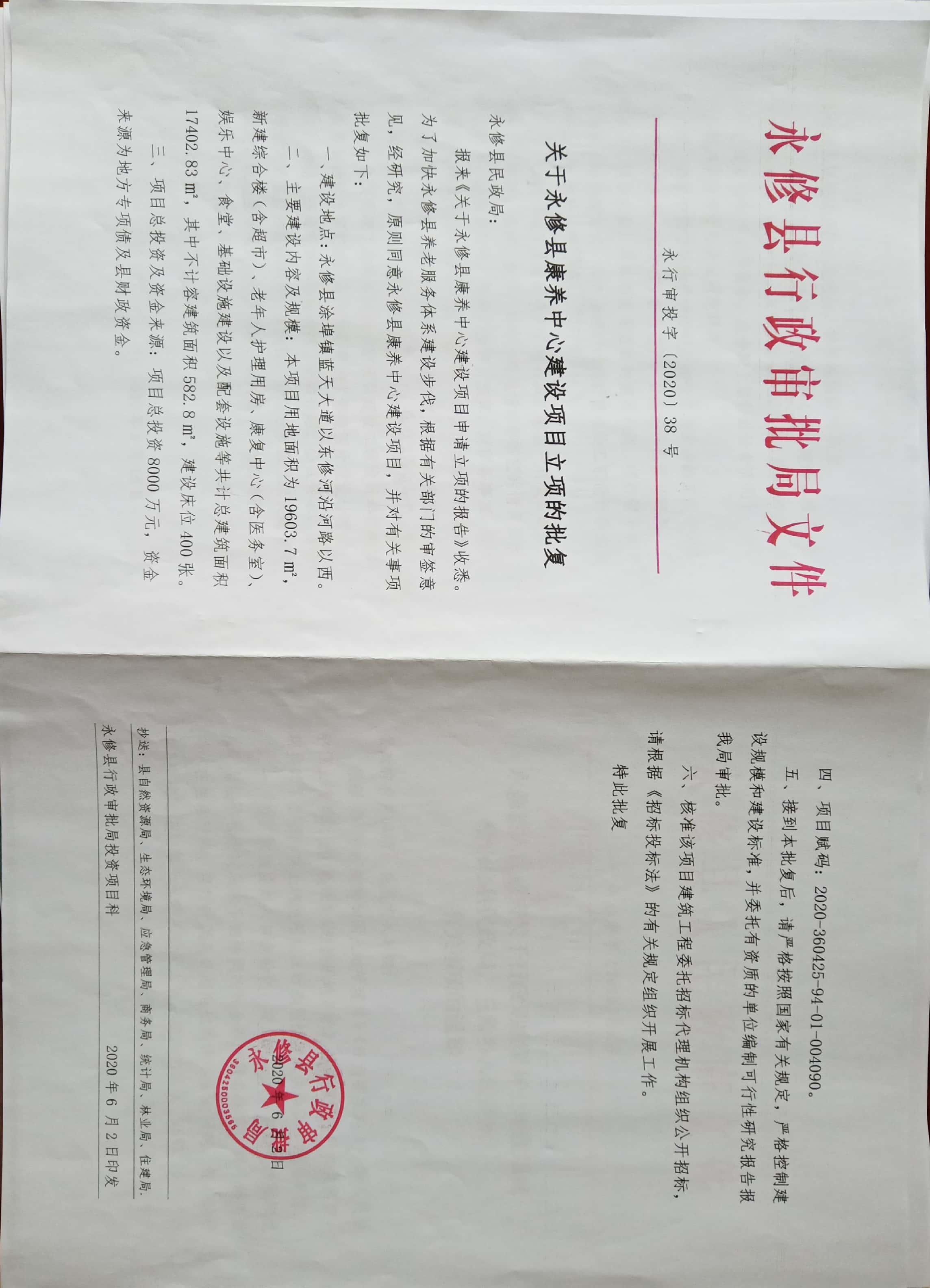 关于永修县康养中心建设项目立项的批复