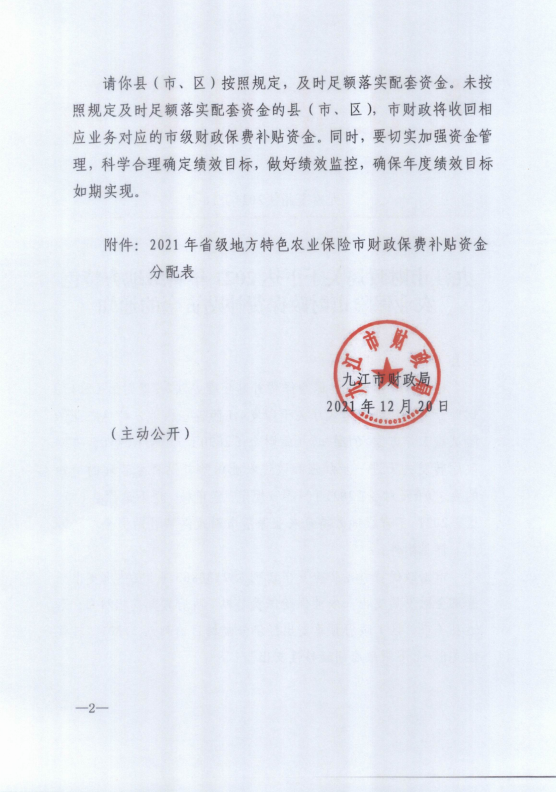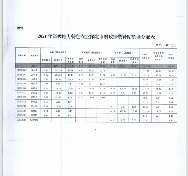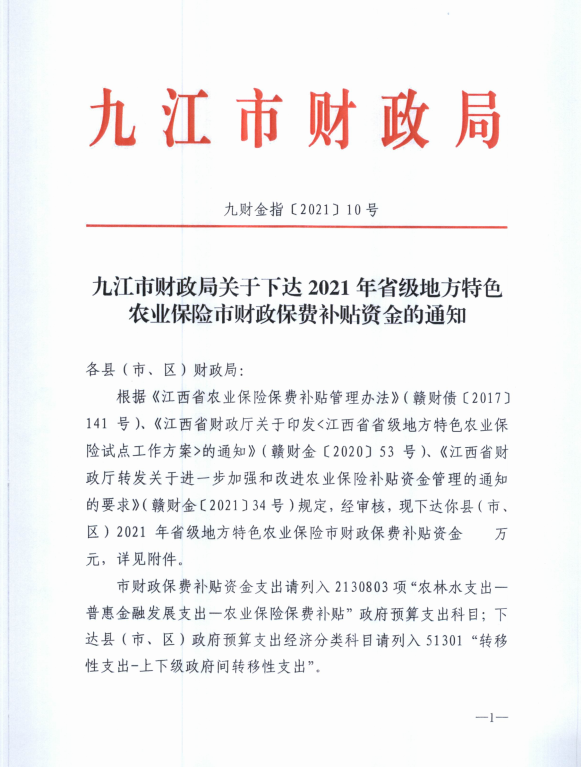 九江市财政局关于下达2021年省级地方特色农业保险市财政保费补贴资金的通知