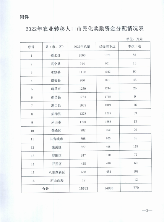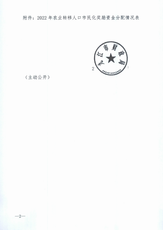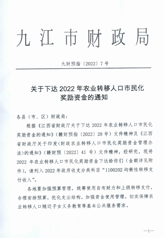 关于下达2022年农业转移人口市民化奖励资金的通知