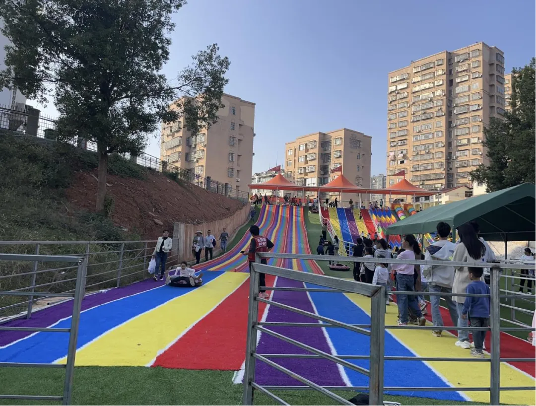 同时,游乐场还铺设了塑胶地面和仿真草坪,假山滑梯等设施采用“提前组装+现场加固”模式安装,与地面固定为一体,以防儿童摔落受伤。