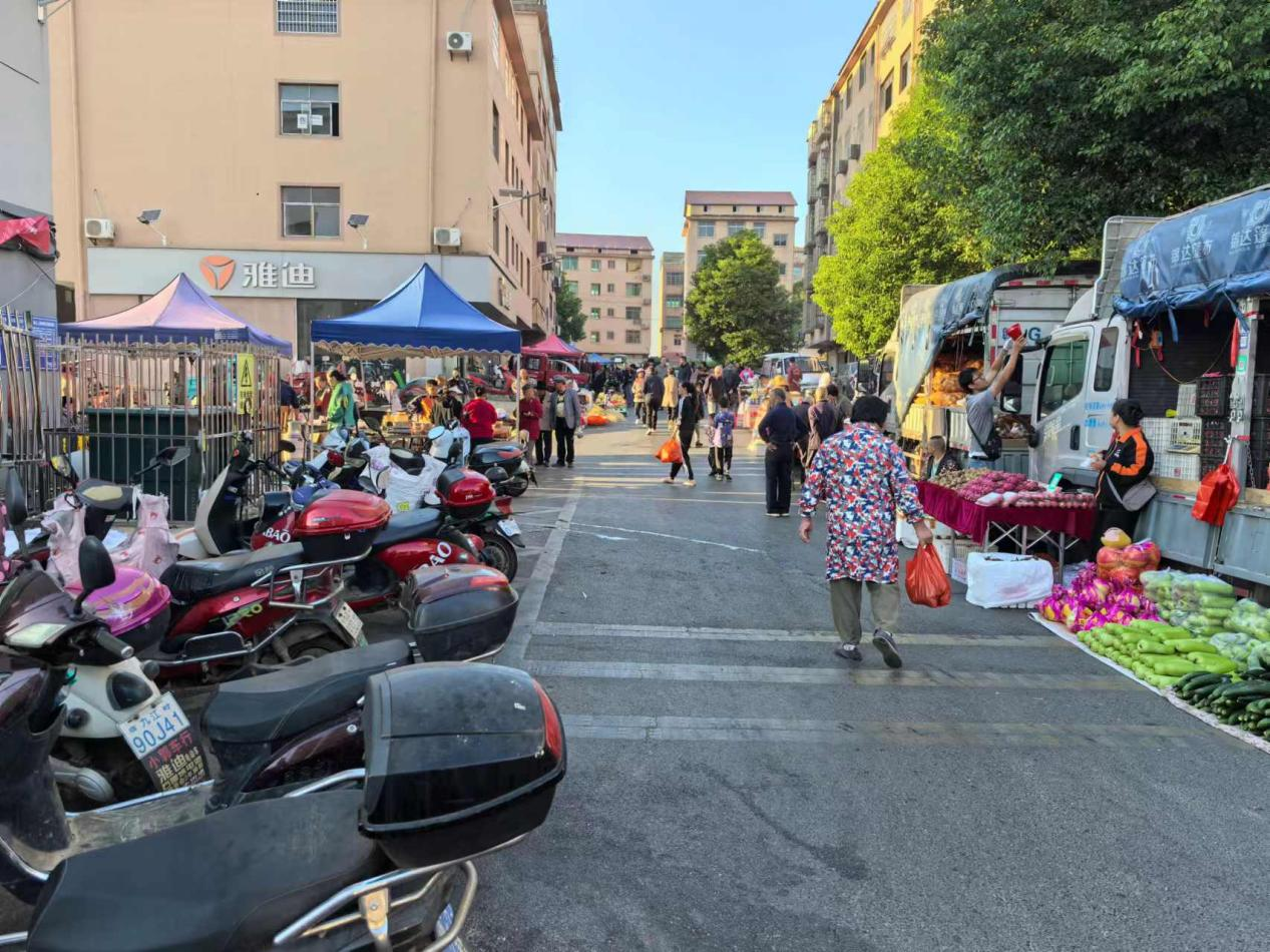 当天清早,在丰安街道南岗社区旁,人声鼎沸,摊主们热情地吆喝声此起彼伏,交织成一首生动的市井交响乐。