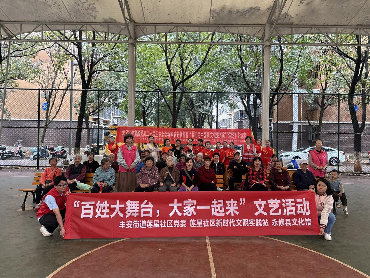 为丰富社区居民精神文化生活,近日,永修县丰安街道新时代文明实践所联合县文化馆,在莲星社区、学苑社区连续开展“百姓大舞台”文艺汇演活动,深化街道“邻聚力”新时代文明实践品牌建设,共建和谐邻里、共创幸福家园。
