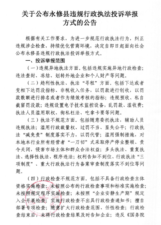 根据有关工作要求,为进一步规范行政执法行为,纠正违规涉企检查,持续优化营商环境,决定自即日起面向社会公布永修县违规行政执法投诉举报方式。