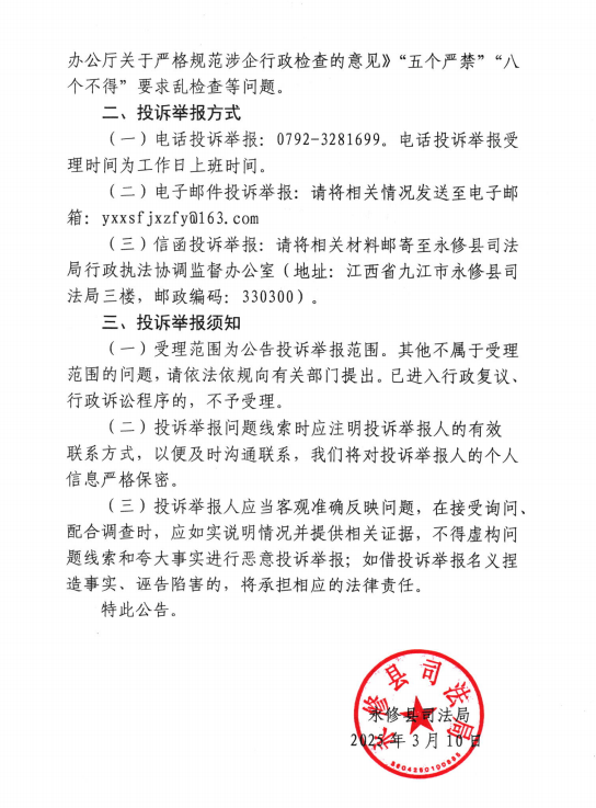 (三)信函投诉举报:请将相关材料邮寄至永修县司法局(地址:江西省九江市永修县司法局三楼,邮政编码:330300)。