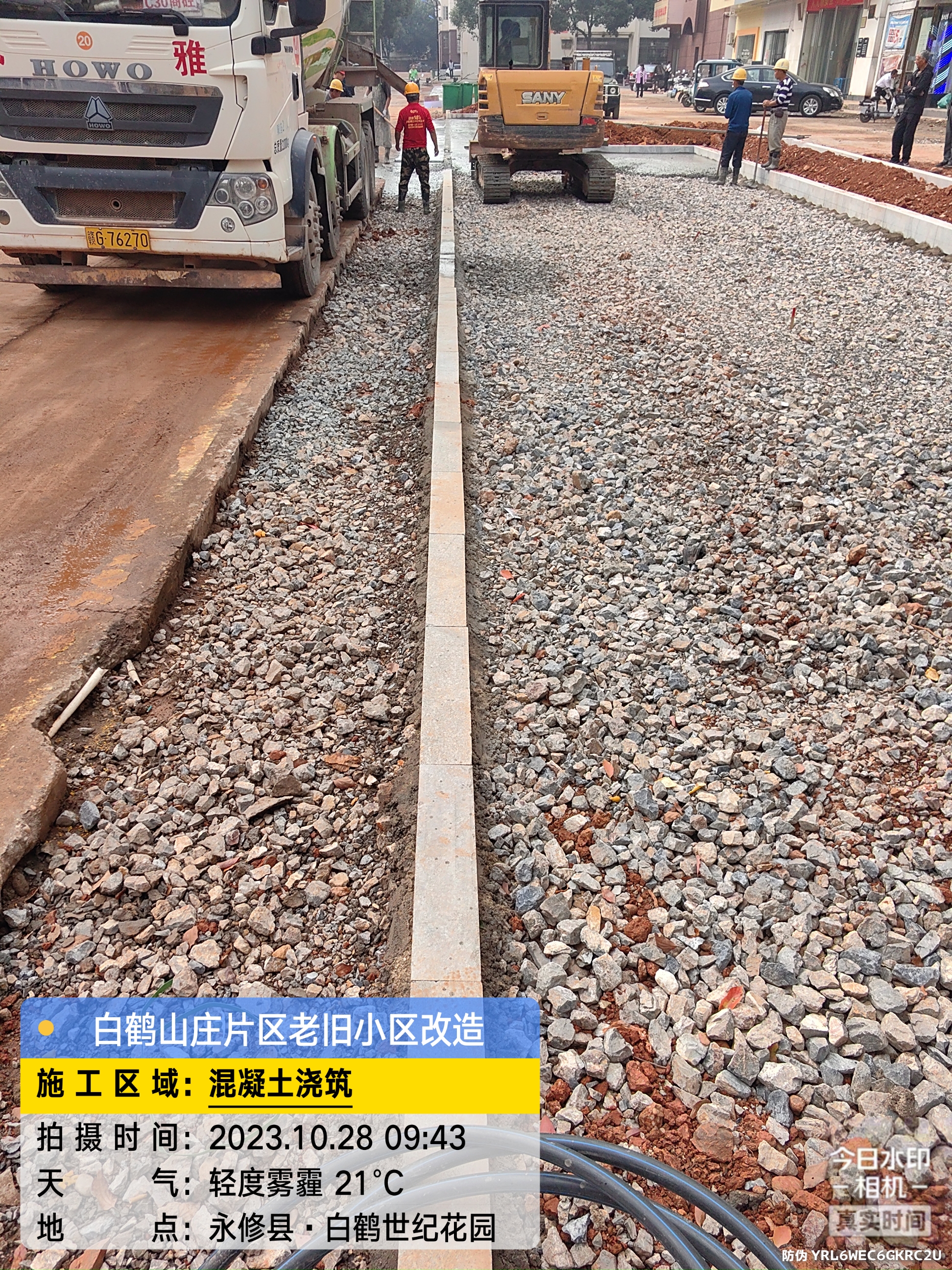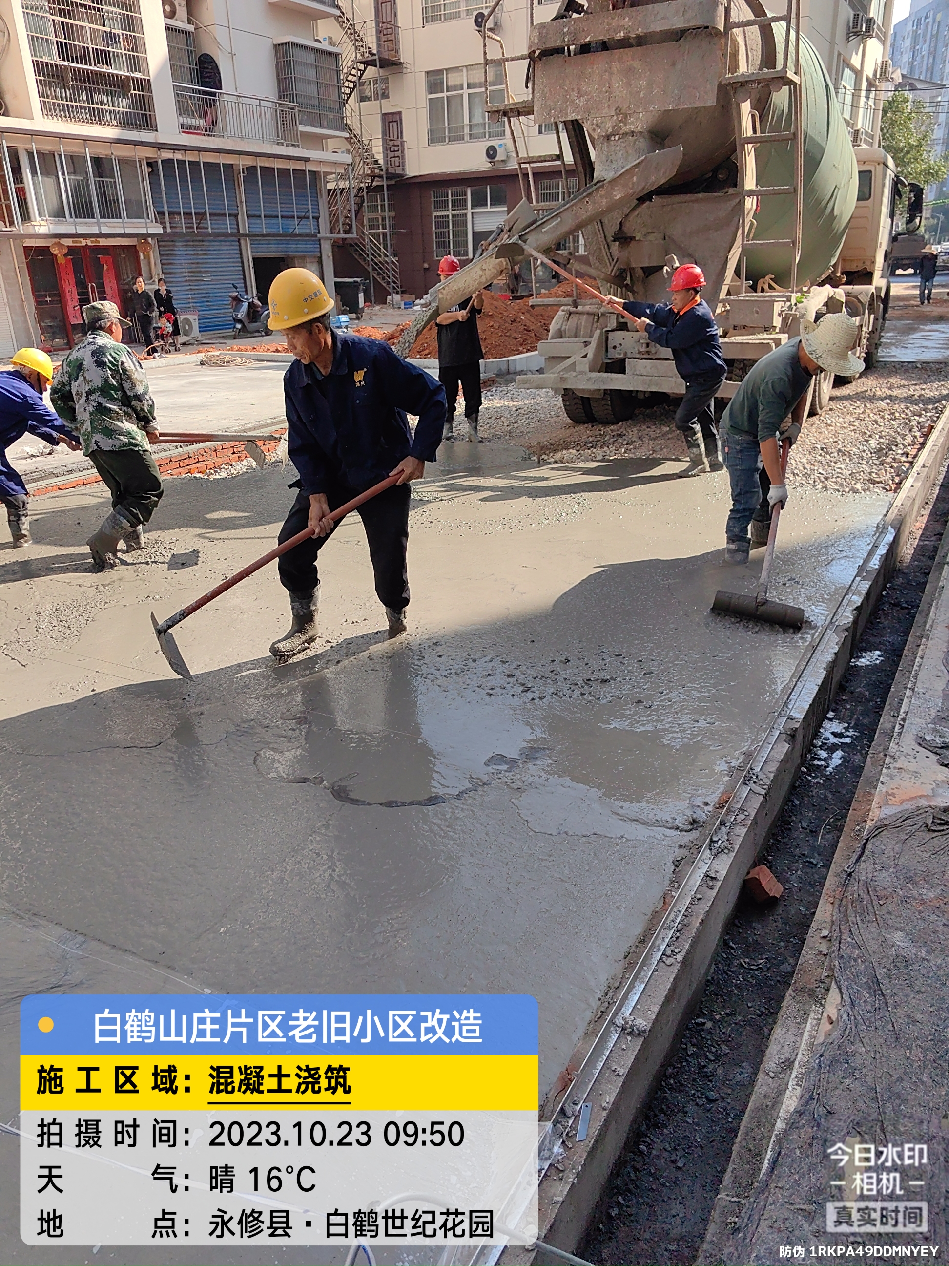 白鹤山庄老旧小区旧改施工信息:目前于10月21日开始进行小区道路混凝土浇筑工作,下一步打算进行沥青铺设,预计今年年底旧改工作全部完成。