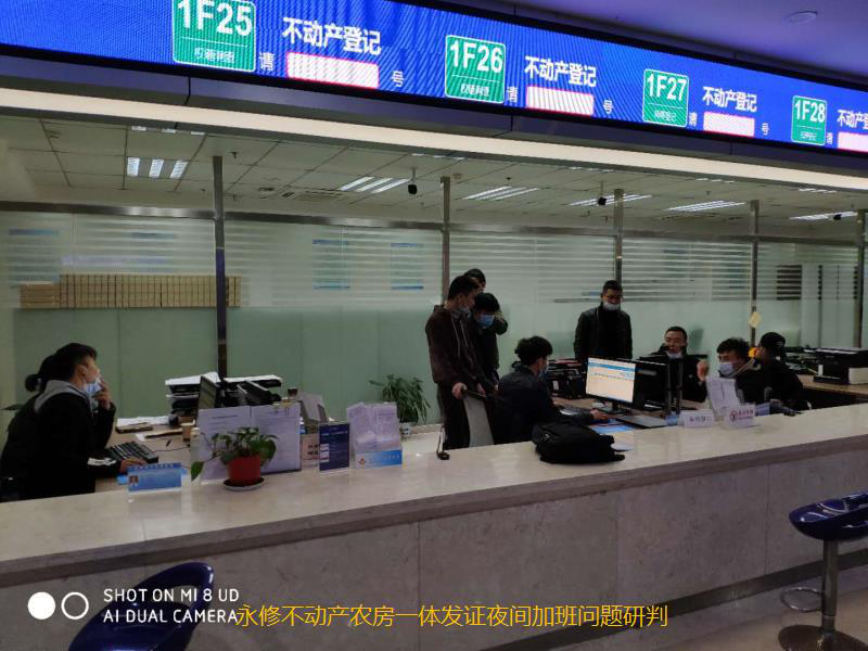 值疫情防控局面良好、复工复产着力推进之际,永修县不动产登记中心呈现出一片忙碌景象,白天不仅正常受理不动产登记业务,晚上,农房一体发证作业人员和登记中心工作人员一道挑灯夜战,全力铺开农房确权登记发证工作。