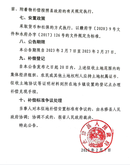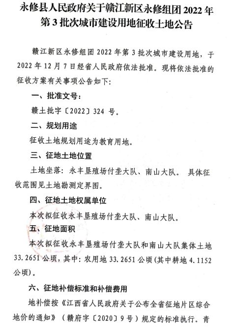 赣江新区永修组团2022第3批次征地公告(县政府23年2月7日发文)