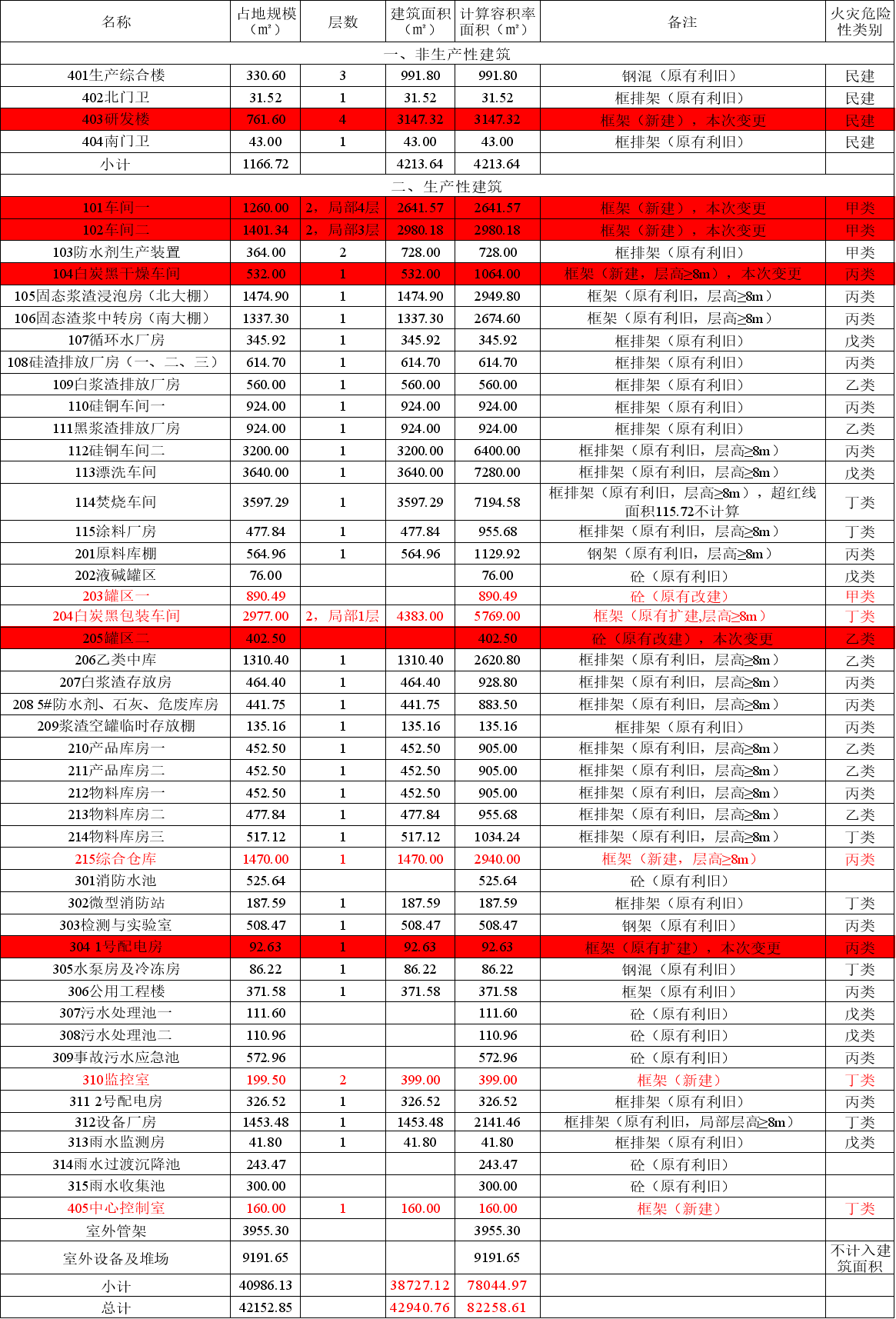 江西星火狮达科技有限公司提交的“江西星火狮达科技有限公司厂区改扩建规划建筑设计变更方案”,此次变更的建筑物:101车间一(甲类)、102车间二(甲类)、104白炭黑干燥车间(丙类)、304 1号配电间、403研发楼、205罐区二、204白炭黑包装车间(丁类)。本项目规划改扩建设计变更方案满足建筑密度、防火间距、容积率、绿地率等规划要求。