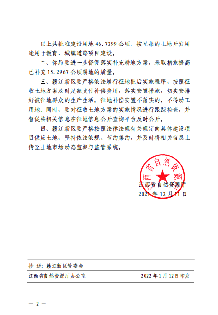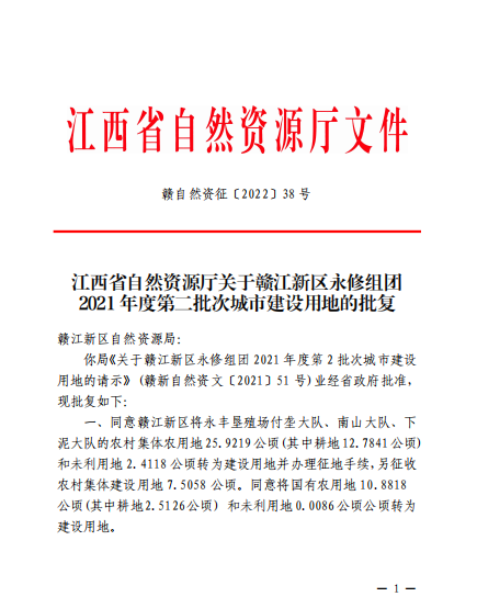关于赣江新区永修组团2021年度第二批次城市建设用地的批复