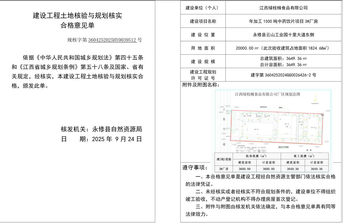 江西绿枝橼食品有限公司的年加工1500吨中药饮品项目3#厂房土地核验与规划核实结果公告