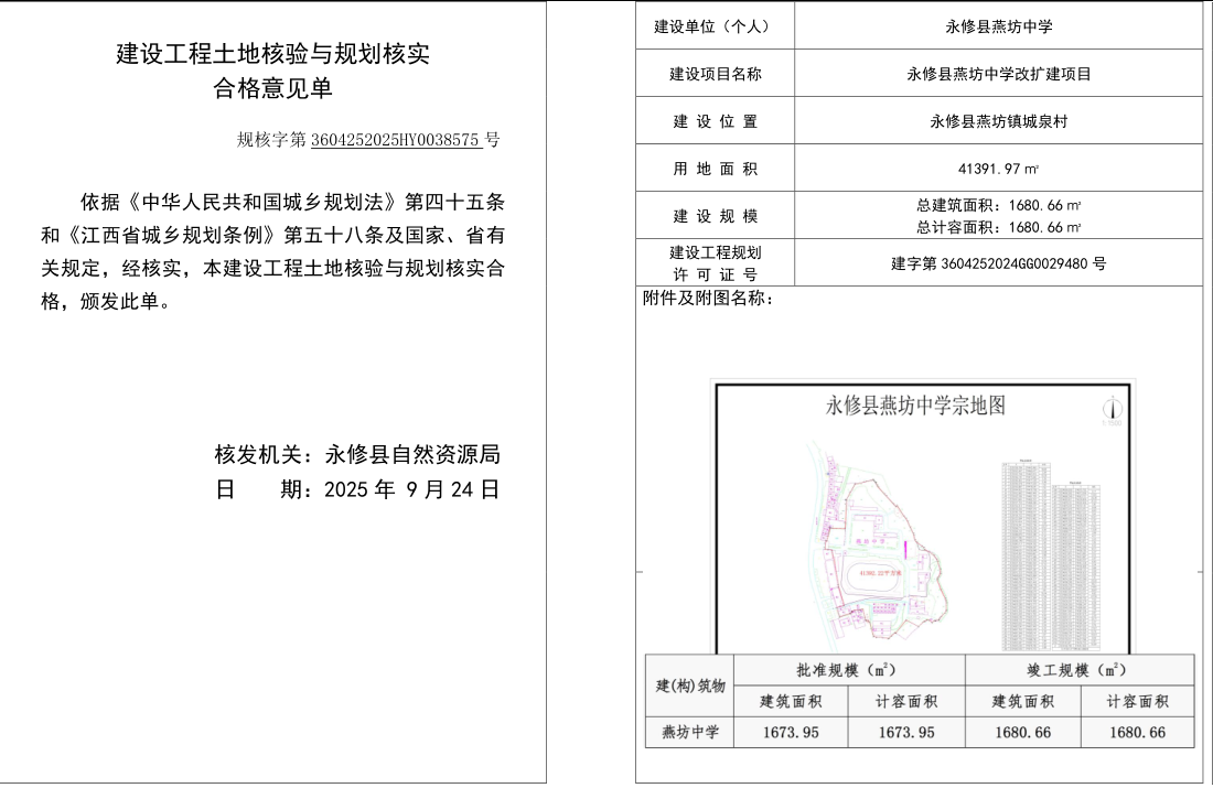 永修县燕坊中学的永修县燕坊中学改扩建项目土地核验与规划核实结果公告