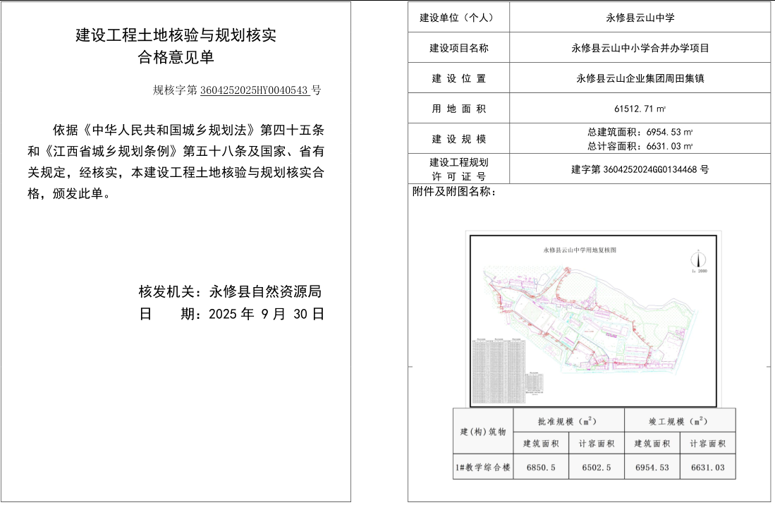 建设工程土地核验与规划核实合格意见单(云山中学)